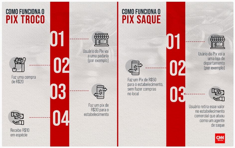 O Pix Troco funciona de forma semelhante. A diferença é que o saque vem acompanhado de uma compra no estabelecimento, para a qual o cliente pode solicitar o troco em dinheiro físico. Ou, como explicado por Saldanha, o cliente paga em dinheiro físico e pede o troco em Pix. No final, um extrato comprovará a transação, que será computada pelo Banco Central.