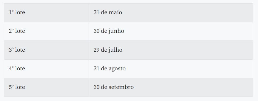 A restituição será paga em cinco lotes. O valor será colocado à disposição do contribuinte na agência bancária indicada na declaração. Confira as datas de pagamento: