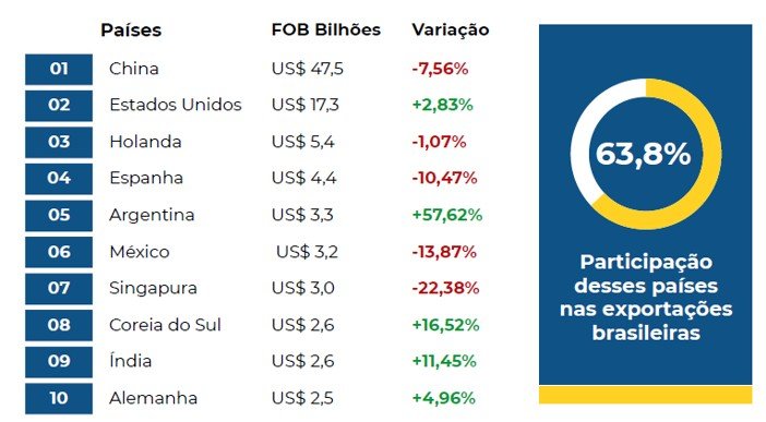 10 principais destinos das exportações brasileiras