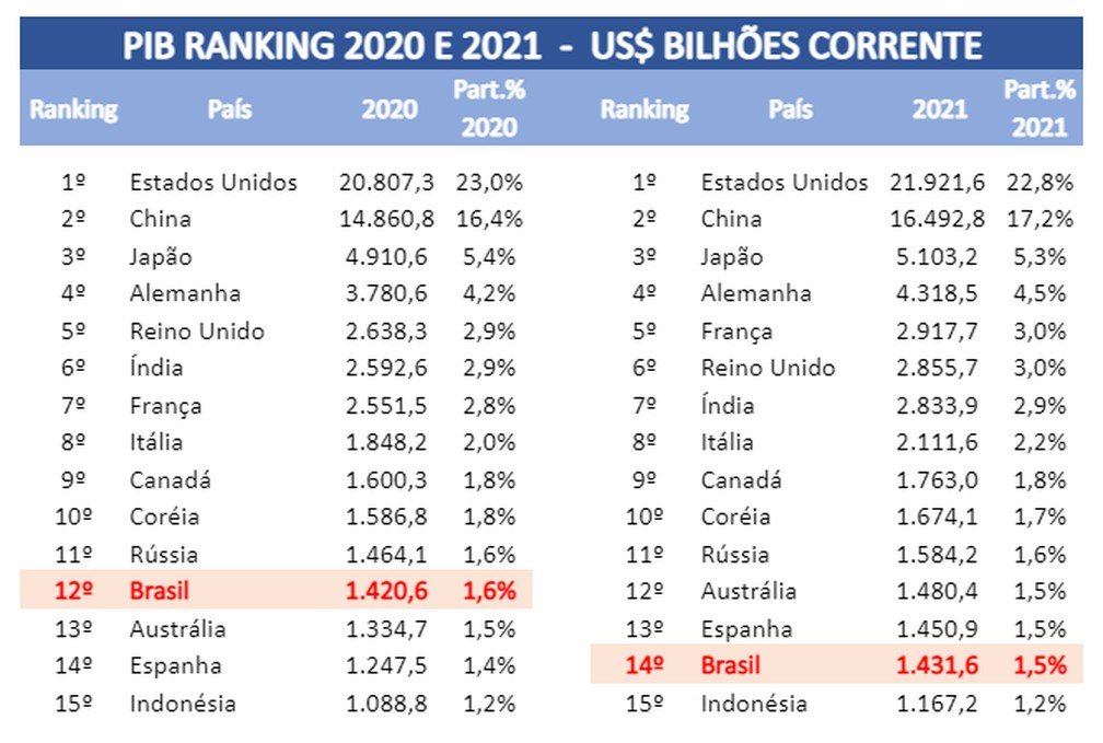 O comparativo considera o PIB dos países em valores correntes, em dólares.