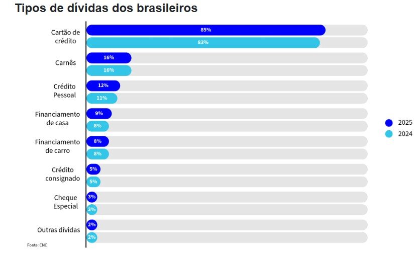 Cartão de crédito (85,1%), carnês (16,2%) e linhas de crédito pessoal (12,1%) são as dívidas mais comuns entre os brasileiros ao final de 2025. Em percentuais um pouco menores, essas também foram as principais dívidas das famílias brasileiras no final de 2024.