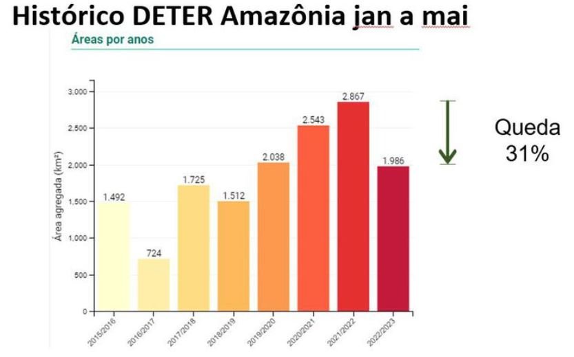 "O governo atual recepcionou [da gestão anterior] o desmatamento em alta na Amazônia, em uma faixa bastante importante. O dado que o Deter acaba de disponibilizar representa uma queda de 10% no mês de maio, comparado com o mês de maio do ano anterior. No acumulado de janeiro a maio deste ano, uma queda de 31% no desmatamento", destacou o secretário-executivo do Ministério do Meio Ambiente e Mudança do Clima (MMA), João Paulo Capobianco, em coletiva de imprensa para detalhar os números.