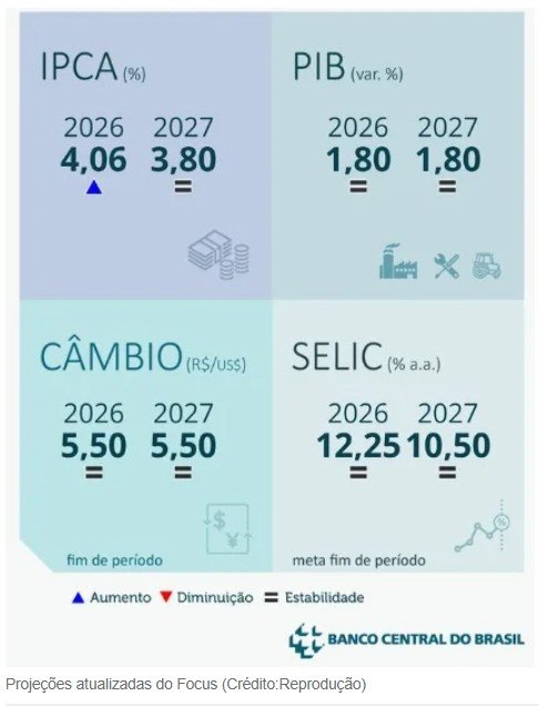 Para o câmbio, a projeção para o final de 2026 foi mantida em R$ 5,50.
