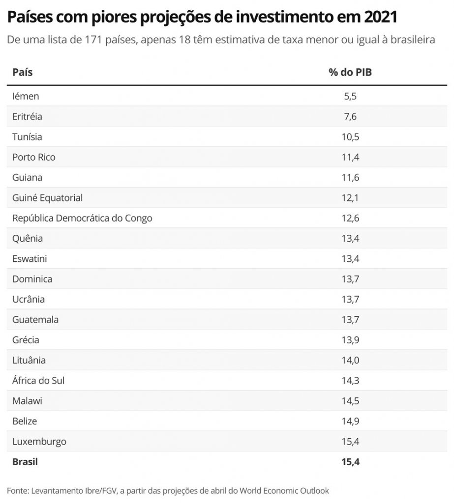 Apenas 18 países possuem projeção de taxa de investimento menor ou igual à brasileira em 2021.