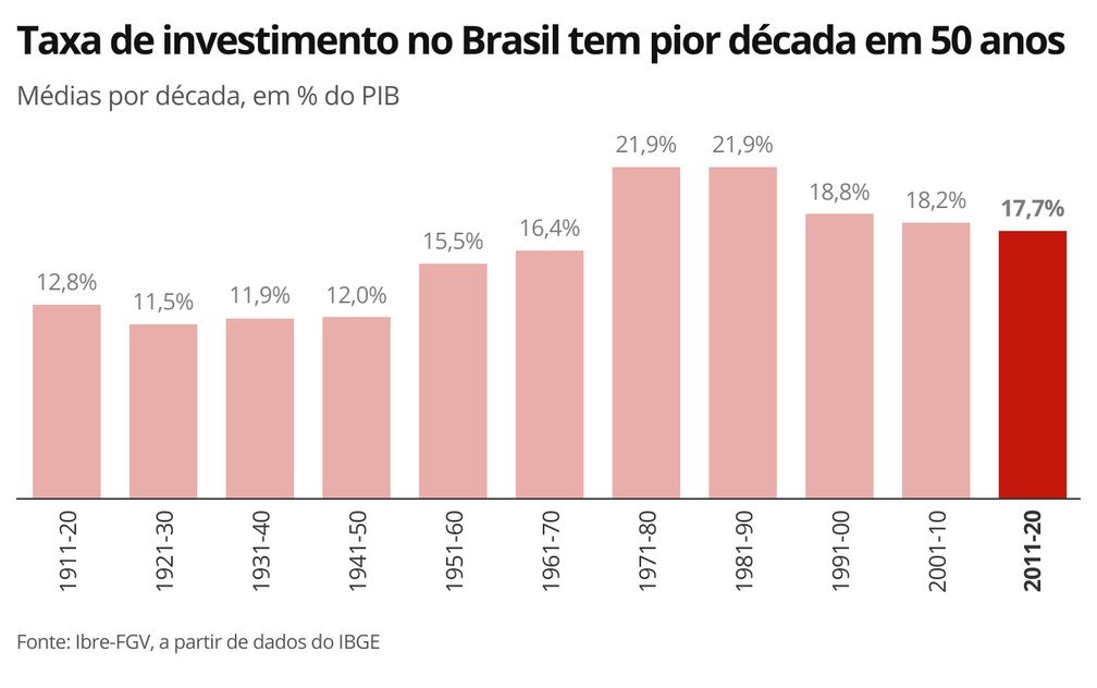 Na média dos anos 2011-20, o indicador ficou em apenas 17,7% do PIB (Produto Interno Bruto), evidenciando as dificuldades orçamentárias do setor público e também a fraqueza dos gastos das empresas com máquinas e equipamentos, infraestrutura, construção e inovação.