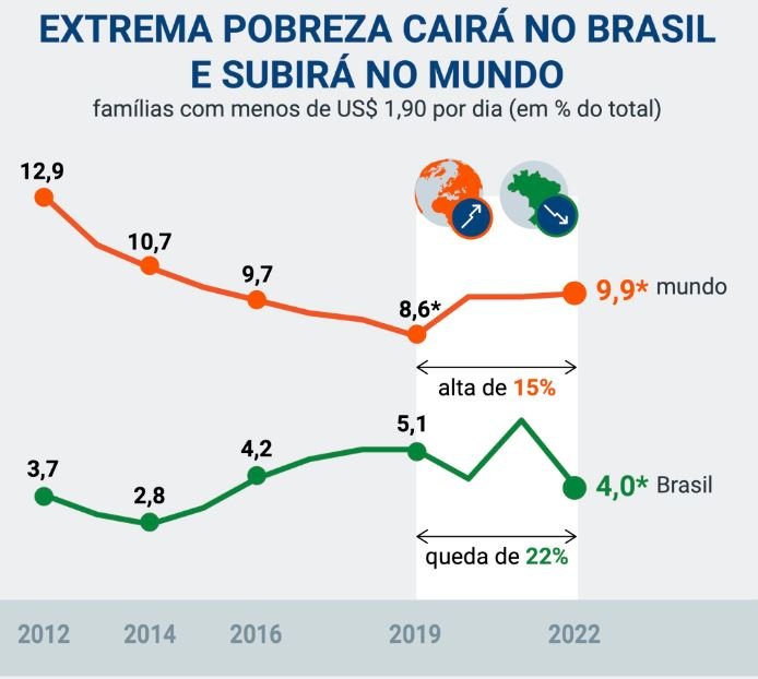 As famílias em situação de extrema pobreza serão 9,9% do total global em projeção do Banco Mundial que Figueiredo usa no estudo. Isso representará alta de 15% em relação a 2019, último ano antes da pandemia. Eram 8,6% de famílias em 2019 e serão 9,9% no fim deste ano. São pessoas com renda individual menor que US$ 1,90.