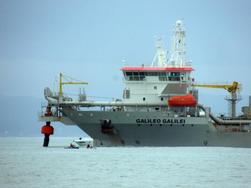 A draga Galileo Galilei já chegou ao Porto de Itajaí para fazer o trabalho de manutenção de profundidade no Rio Itajaí-Açu. Os serviços de dragagem foram solicitados devido às fortes chuvas ocorridas na região, afetando o fluxo de maré ao longo do Complexo Portuário de Itajaí e Navegantes, interditando o movimento de embarcações de maior tonelagem.
