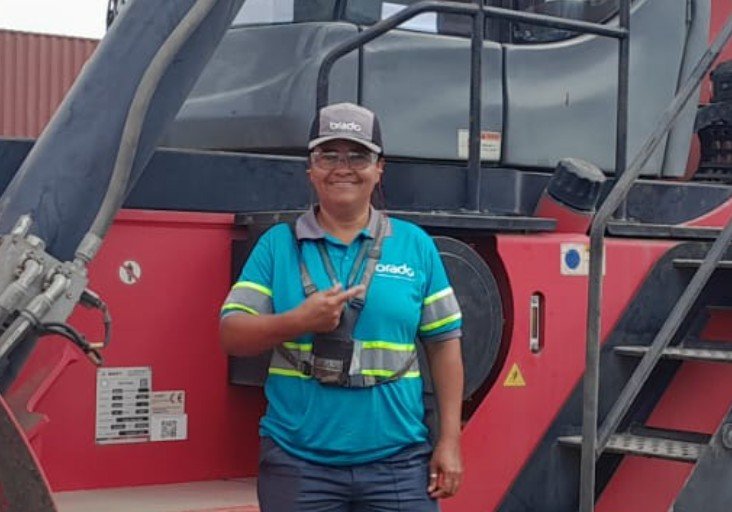 Deborah Lopes, operadora de empilhadeira reach stacker da Brado Logística - Foto: Brado Logística - Divulgação