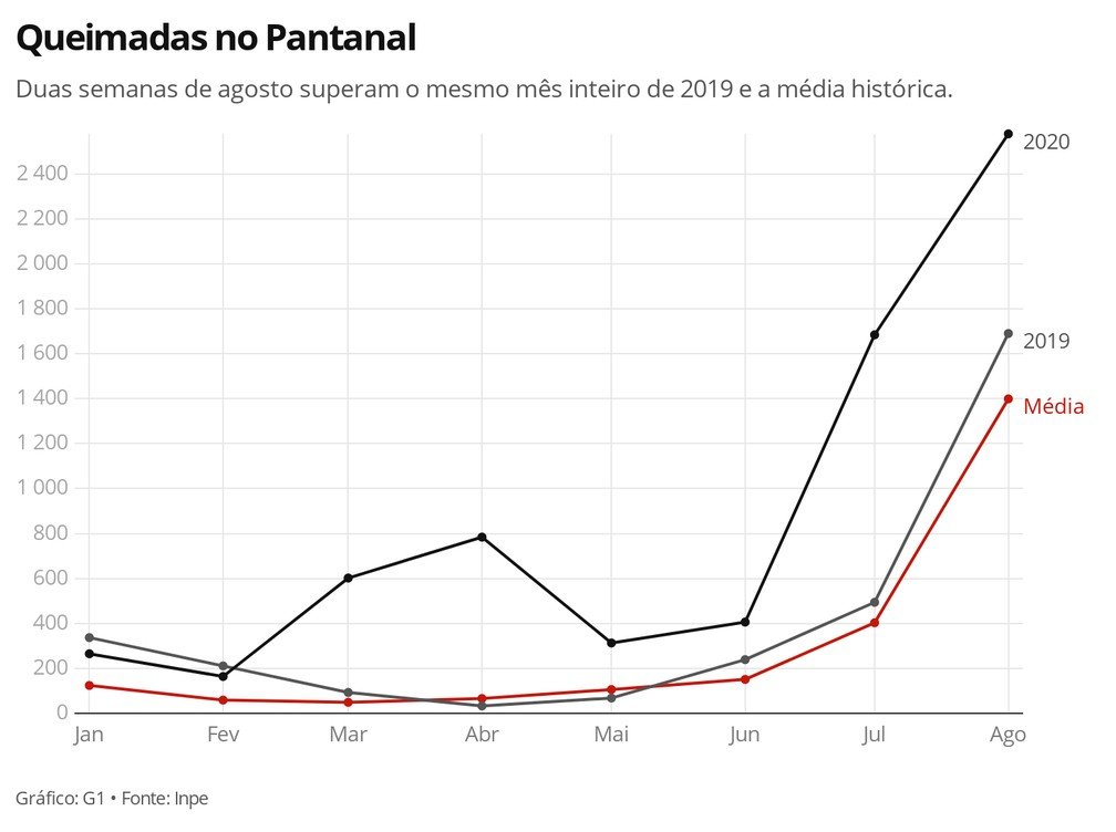 O Instituto Nacional de Pesquisas Espaciais (Inpe) contabilizou mais focos de queimadas nos primeiros 13 dias de agosto deste ano no Pantanal do que durante o mês inteiro de 2019. É menos da metade do tempo, mas o número absoluto já apresenta uma alta de 53%.