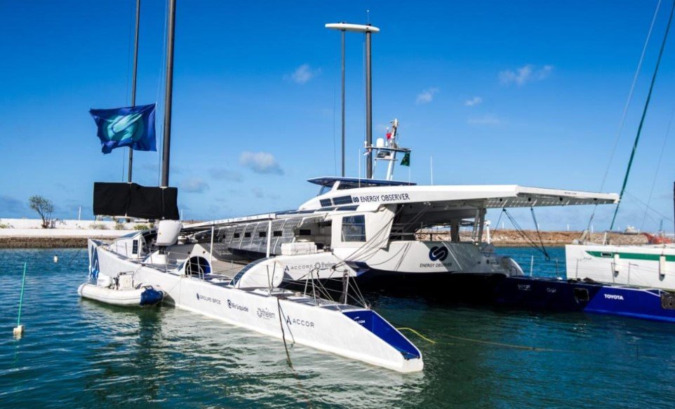 O barco Energy Observer foi o primeiro construído no mundo pela França há sete anos, com o propósito de desenvolver tecnologias de sustentabilidade e promover o uso de hidrogênio verde.