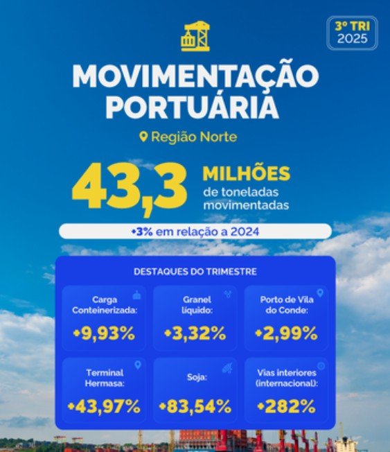 A movimentação portuária da Região Norte apresentou desempenho positivo no terceiro trimestre de 2025, com 43,3 milhões de toneladas movimentadas entre julho e setembro. O resultado representa um crescimento de 3% em relação ao mesmo período do ano anterior, de acordo com dados da Agência Nacional de Transportes Aquaviários (Antaq).