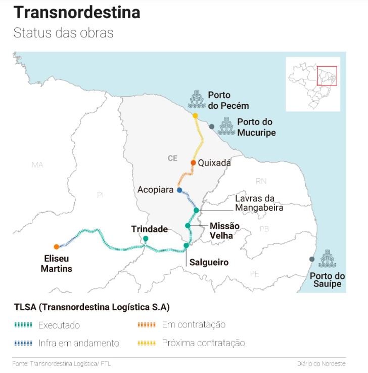 A Transnordestina possuirá uma extensão de 1.210 km, ligando o município de Eliseu Marins (PI) ao Porto do Pecém (CE).